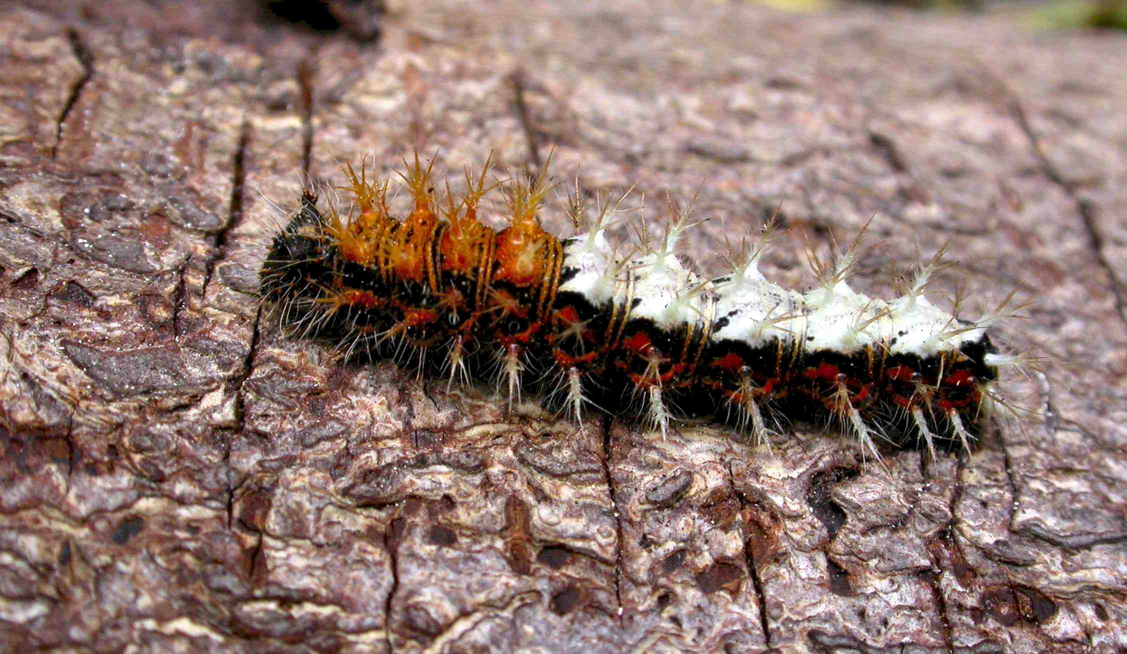 DESCRIPTION: A charming little character that has a black body covered in tufts of ginger and white hairs. The most striking feature is the white upper surface to several segments of the rear giving this caterpillar a resemblance to a bird dropping when viewed from a distance. FOODPLANT: Mainly nettles and occasionally various garden plants. Usually found on Hops in days gone by. SEASON: July to September. |