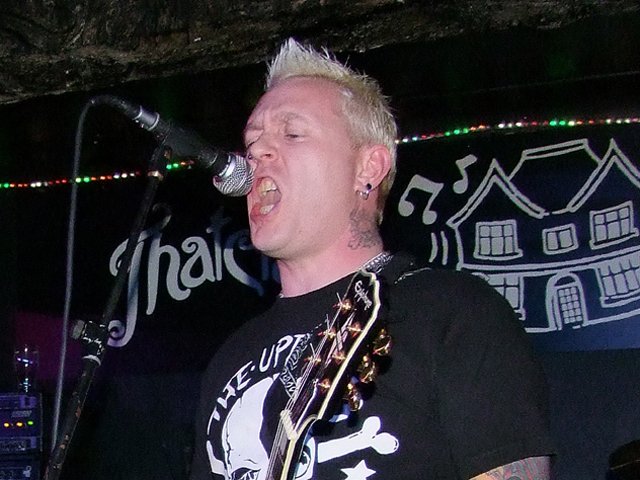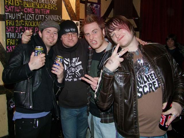 The Distrakted - staying on-line for bigger and better things Freedom Faction are a band I was eagerly anticipating after the previous time I had witnessed them was of no use whatsoever after the PA they played through was a real piece of wank. Add to this the recent CD I have reviewed which revealed five pure punk rock gems and my punk jowls were salivating hard for a bit of retro melody. Tonight’s performance really highlighted how bad the aforementioned PA was as the whole vibe here was upbeat and may it be said, fun. The band has a significant joy to their tuneage which I think adds to the appeal of each and every song. 'Vive La Punk' was choice, 'Blah, Blah, Blah' totally awesome, 'Come Up And Get It' as feisty as expected and the new 'Loser' a nice tease. I have found a right pearl with this lot and perhaps the crew may struggle to meet the needs of the new-skool brigade but old hearted spiky tops should adore this. The pointers for the future would be to work on the visuals a little with the guitarist being a bit more mobile and adding a tad more beef to the old six stringer. These are only personal opinions and not criticisms but being the passionate picky bugger I am I feel it only right to try and squeeze the best out of every band especially those I respect. Either way you take it this was still fuckin' great and I really lapped it up. My missus and young daughter came down early especially for this and weren't disappointed either - yeah - a fungal family feather in yer caps. Great frontlass, superb bass tumbles, nice simplistic guitar and some solid drumming all helped the final product and I want another FF fix as soon as. Myself and Johnny Talents enjoying the night A break next as RBH spilled out their semen-stained sonics to a crowd that was both accepting and responsive. I went to the chippy at this point with my family as my daughter requested we keep clear of the noise as she had no desire to watch the vulgarity of the band under scrutiny. Eating our chippy tea outside actually made the band sound more insane than ever and flashbacks of a bad sherry experience where I collapsed in the pub car park for 5 hours and awoke to the cacophonous RBH playing in the background came flooding back to haunt me. Terrifying! Bassist Noz came out after the set and I explained my absence and he explained how all went well and the crowd gave good applause. That will do for me and next time RBH will be playing further afield - much to the relief of many a Stockport resident I suspect ha, ha. The next two bands were both fuckin' brilliant with Stomping Ground just climbing upwards all the time and the Smack Rats being totally effective both musically and visually. Back to Stomping Ground and with care and practice this band has just got better and better despite a few financial hindrances that are holding the outfit back as far as releases go. The set held the audiences attention, had a few dancing and flowed from one track to the next with accomplished ease. Like I say - the next step is to get recording and then move further afield and start building the experience up and promoting the fine tunes the band have worked so hard to master. The comfortable way in which this lot perform at The Thatched House is expected but the test will come when playing to a neutral crowd with many a critic in the mix. I can envision no problems and the sooner they spread their wings the better. The Smack Rats are idiocy incarnate and the antics of the adventurous frontman are both exciting and distracting insomuch as the band are a riotous well organised crew who get overlooked due to all eyes being on the vagrant vocalist who is here, there and every bloody where. Tonight was no exception as the gob at the front accosted everyone in sight and rolled about in a most humorous and good-hearted way with all and sundry. At one point he went behind the bar and tried to fill his mouth with a bucket load of beer whereupon a frown from the landlord was enough to get him back into the main gigging arena. There is a definite gusto about this band and the piston pumping backdrop of noise was made by a fine band putting on a very good show themselves and ones who deserve equal attention. All good on the Smack Rats front and surely more to come from this fungalised bugger and a bright future ahead. Oh I hate the Cock Sparrer cover by the way - not because it is played badly but because I hate covers of crap bands - ha, ha - you know me underdog arse all the way. Smack Rats, myself and the two fingered Mr Talents Kings of the Delmar were a very good band and really opened my eyes when I saw them about 4 years ago at Morecambe’s Nice 'n' Sleazy Festival. After a split that would have finished most bands we have a 3 piece that isn't a very good band. In truth Kings of the Delmar are a fuckin' amazing band and this tonight was totally fantastic. All 3 components are supercharged and the tight, talented outburst was both tuneful and full of rockin' riffs. Song after song was met with gratifying applause and the dancing few had a blast as they tumbled to the noise of a band very much on form. 'TV Personality' is always a good do for me from a set that didn't have one dud number. A genuine cut above.