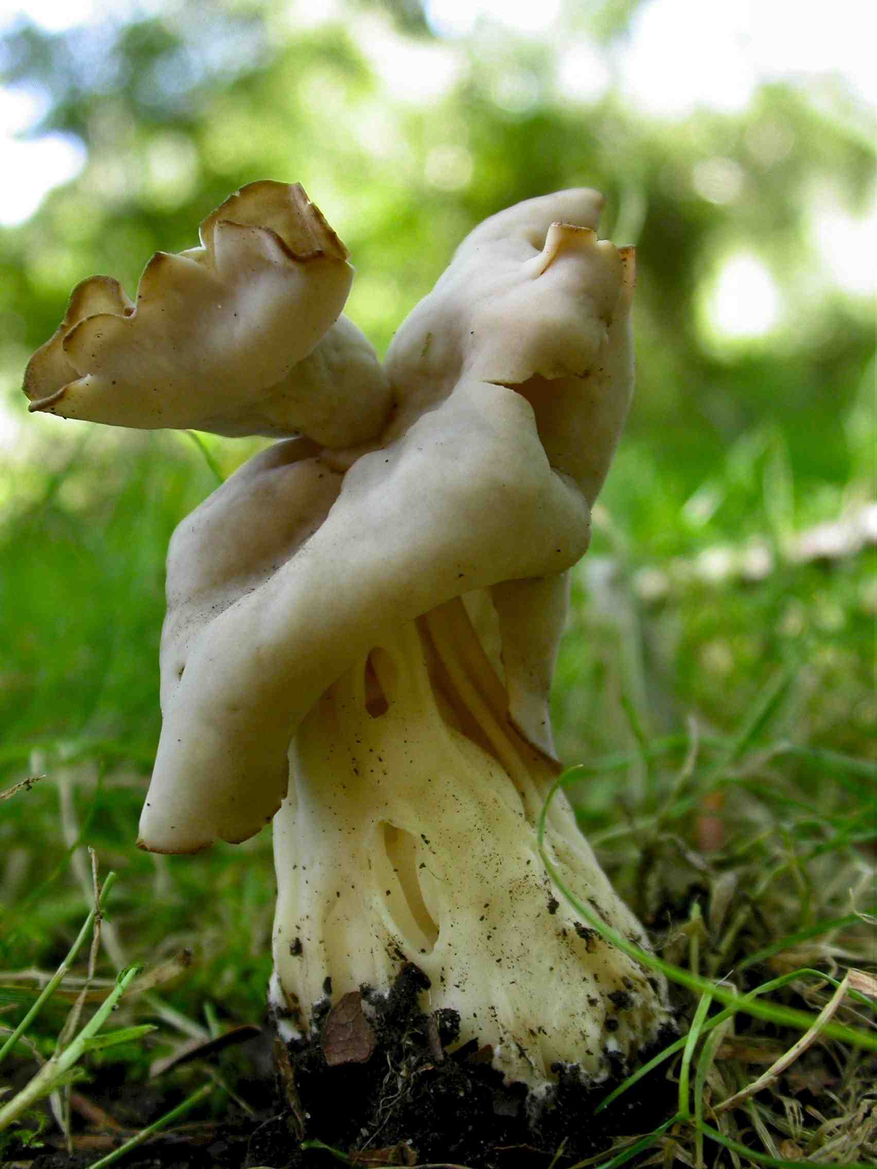 FRUIT BODY: Up to 4cm tall. A creamy-white saddle-shaped cap that is variably contorted with many undulations. The undersurface of the cap is ochre and slightly downy. The stem is white and deeply furrowed and tapers towards the apex. GILLS/PORES: N/A. FLESH: Thin, white and rubbery. No taste or odour. SPORES: Cream and elliptical. HABITAT: Under beech or oak. SEASON: Frequent.  Summer to late autumn. EDIBILITY: Edible but poor.
