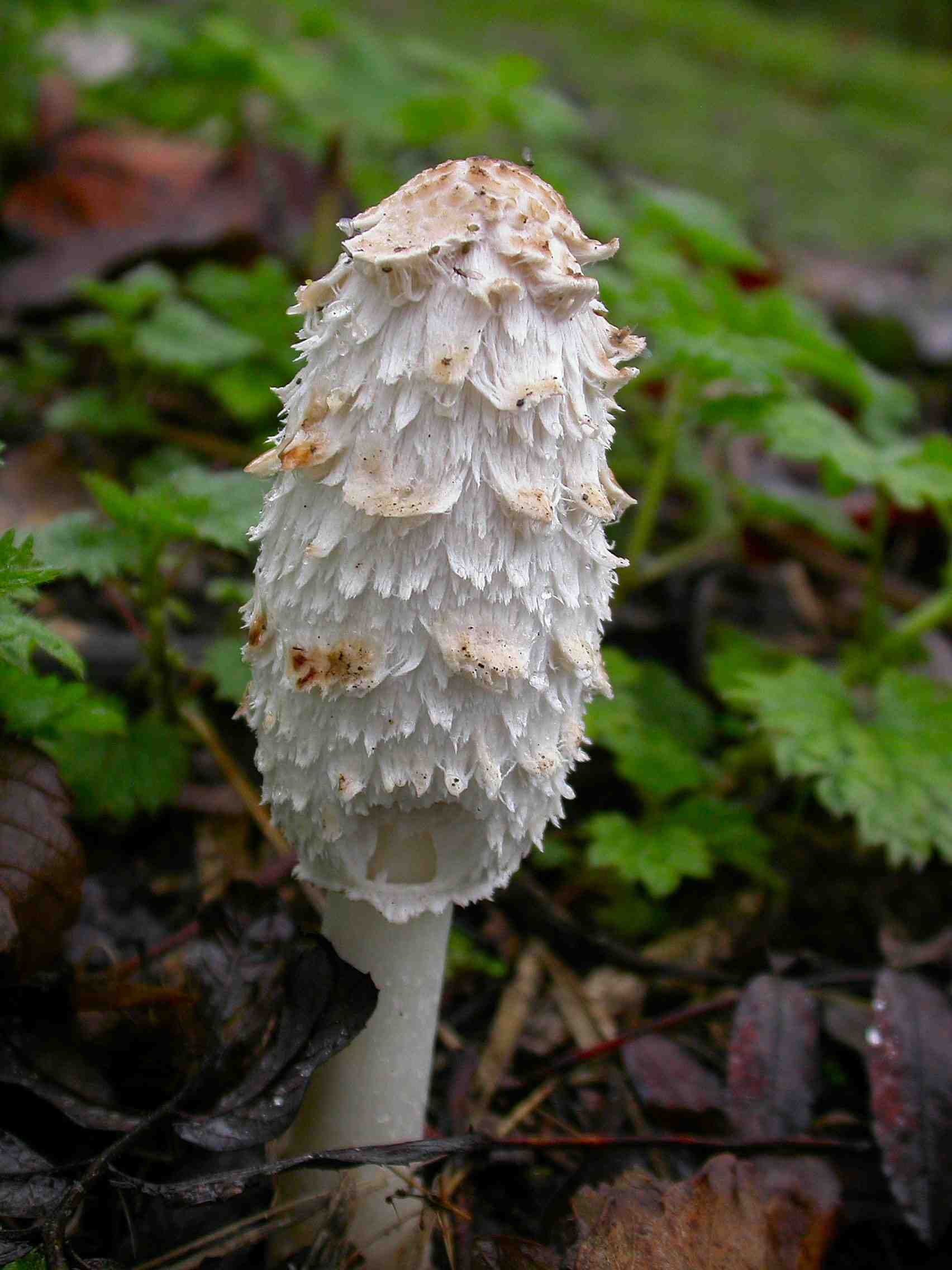 CAP: 5-15cm tall, 2-5cm in diameter. Broad, column-shaped becoming more bell-like in appearance. Starting white, dry with recurved scales and a brown central disc that slowly breaks up. STIPE: Up to 20cm tall. White, smooth and hollow. Bulbous base that can be overlooked and veil white and membranous. GILLS/PORES: Gills are adnexed to free starting white and becoming pink before finally deliquescing to a black, inky liquid. FLESH: White, soft and fibrous with a pleasant smell when young. SPORES: Black, smooth and elliptical. HABITAT: Singly or in troops on grassy areas. SEASON: Frequent. Mainly late summer - autumn but if conditions are right can appear any month of the year. EDIBILITY: Edible but must be taken when young. |